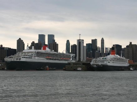 This photo (from Wired New York) shows the massive Queen Mary 2 lodged in its Hudson River perth beside the Queen Elizabeth 2.