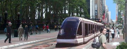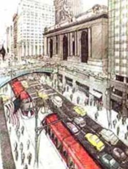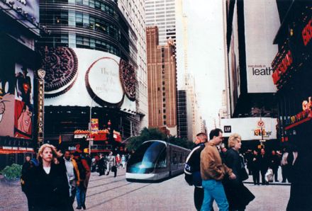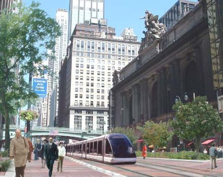 Two groups are supporting plans to put a trolley line down 42nd St from river to river. Vision42‘s proposal (seen above) would see the thoroughfare pedestrianised and arborised, whereas that of the Municipal Arts Society (below) would retain automobile access.