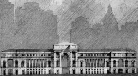 Peter Pennoyer envisions a classical pile with a large plaza accompanying. (Elevation above, plan below).