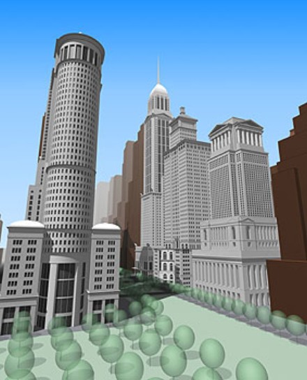 Though designed by noted (neo-neo-)classicists, these buildings are not strict classical expressions, though one of them bears a resemblance to Adolf Loos’ ironic massive column entry to the Chicago Tribune competition. Instead, as the New York Sun‘s James Gardner points out, this new take on the redevelopment