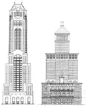 Richard Sammons’s neo-deco skyscraper on the left, and Thomas Gordon Smith’s somewhat charmingly clunky construct on the right.