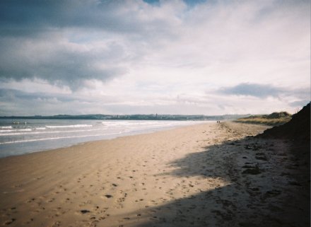 For those who don’t know St Andrews, I’ve provided a little map at right. The West Sands is a long stretch of beach that is about a mile and a half long down the coast from the town of St Andrews to Out Head.