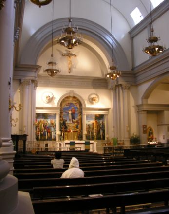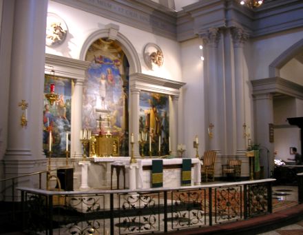 This closer view of the altar shows the Sean Delonas mural which Steve M. finds opprobrious, flanked by little putti. Inscribed above are the words “HIC EST ENIM CORPUS MEUM • ET CALIX SANGUINIS MEI”. On either side of the altar, just out of view, are little shrines to the Sacred Heart and the Virgin of Guadalupe.