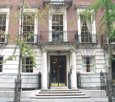 One of my favorite buildings in Midtown is the Board of Directors office of the U.S. Trust, at 9-11 West 54th Street. This fairly reserved wide neo-Georgian townhouse was designed by McKim Mead & White as a residence for Mr. James J. Goodwin when the West 50’s was full of beautiful townhouses instead of mediocre office buildings.