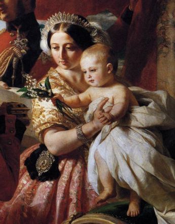 This is most certainly my favourite Victorian portrait (Landseer’s Queen Victoria and Prince Albert at the Bal Costumé of 12 May 1842 is comely, but a tad too Gothick). 1 May 1851 depicts the ancient Duke of Wellington presenting a gift to his godson, Prince Arthur, Duke of Connaught, on his first birthday. Prince Arthur is supported by Queen Victoria, and Prince Albert stands behind the Queen.