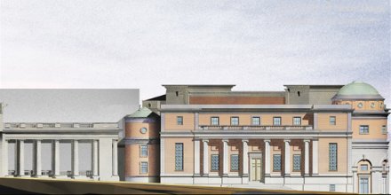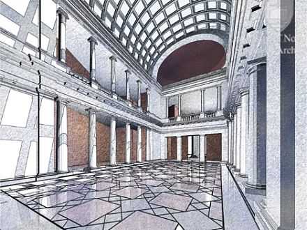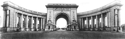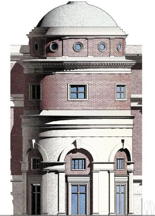 An overall plan, including the curvaceous collonade and arched portal of the Manhattan Bridge.
