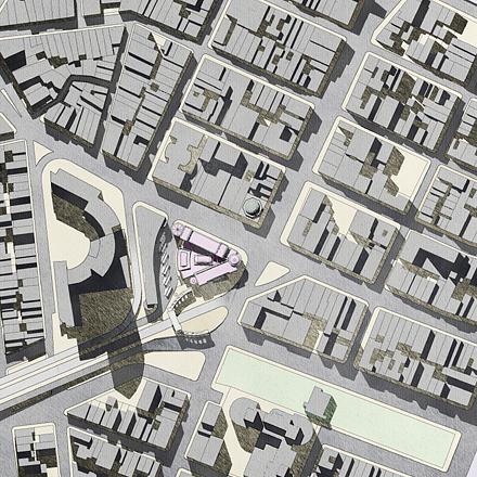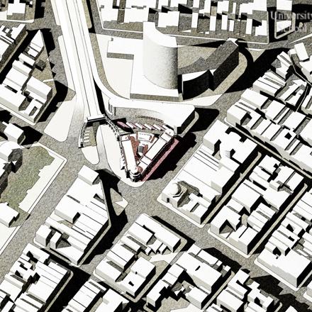 Chinatown’s Fung Wah bus is famously one of the cheapest ways to get to Boston, costing only only $15 to get to New York’s most northerly suburb. The preferred mode of transport between home and university for many a student and an economical mode of transport for the traveller-in-the-know, the chief deficiency of the ‘China bus’ as it is known is that in New York it just lets you off on a random street corner at the eponymous end of the Manhattan Bridge. Wendan Tang, a graduate student at Notre Dame’s School of Architecture (arguably the best in the country), produces his solution to the problem with a hypothetical design for a bus terminal in Chinatown, nudged between the bland modern Confucius Plaza and the beautiful classical entrance collonade and arch of the Manhattan Bridge.