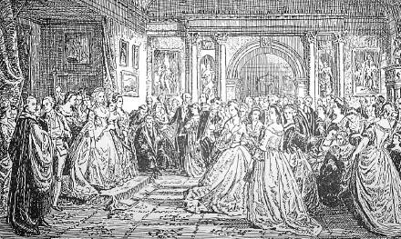 The First Lady, Martha Washington, presides over a reception in the Presidential residence, New York, 1789.