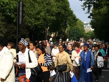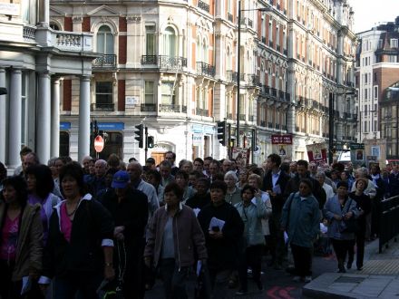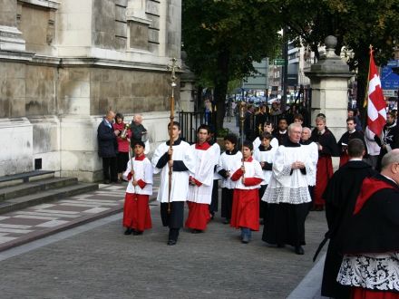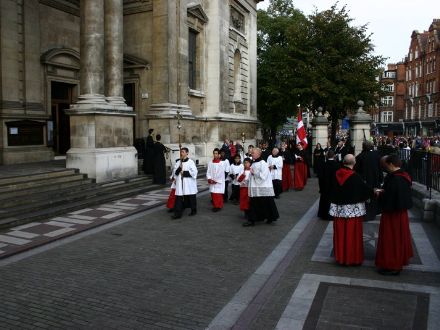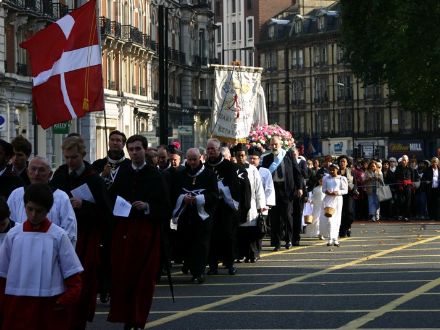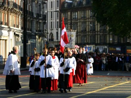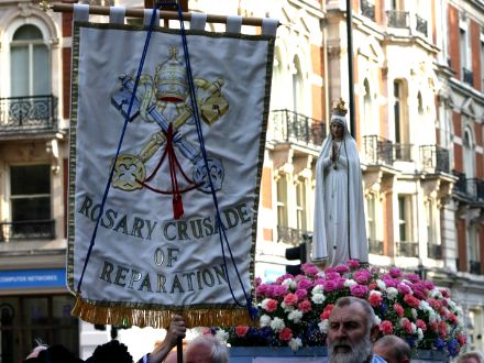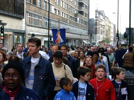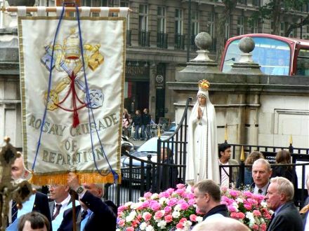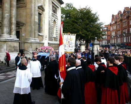 THE BLESSED VIRGIN HAS quite the legion of followers at her beck and call, and a good many battalions (perhaps even a regiment?) turned up on October 14 for the annual Rosary Crusade for the reparation of sins. The event began with a procession from Westminster Cathedral near Victoria Station, through the streets of London, to Brompton Oratory in Kensington. A statue of Our Lady was borne aloft by members of the Catholic Police Guild the whole way to the Oratory, where Benediction was held. We bring you these photos, taken by, amongst others, Matt Doyle, and Ken Simpson, all of which we found via ‘Joee Blogs‘, a Catholic medical student in London.