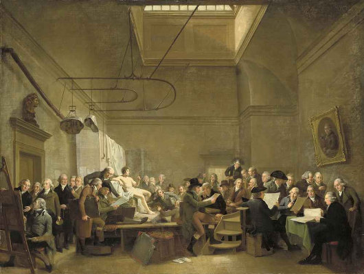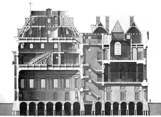 The classical façade is composed of five bays, the central three of which comprise a portico topped by a triangular pediment. The entrance hall leads to the central staircase, with the oval-shaped concert hall, the largest room in the building, just beyond. Ascending the staircase, the Zuilenzaal (Hall of Columns) sits above the foyer and forms the principal storey of the façade. Rising another storey, the oval lecture hall rests atop the concert hall below. Here physical experiments were exhibited, and human dissections were practiced. Finally, up another flight of stairs and situated above the Zuilenzaal was the picture room were nudes were sketched or painted and where works of art were exhibited.