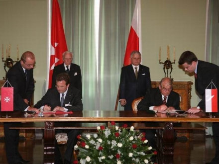 After conclusion of talks between the two delegations Zbigniew Religa, Minister of Health and Albrecht von Boeselager, Grand Hospitaller of the Order of Malta in the presence of the President of the Republic of Poland and the Grand Master of the Order of Malta signed a cooperation agreement in the area of health care between the Republic of Poland and the Sovereign Military Hospitaller Order of Malta.
