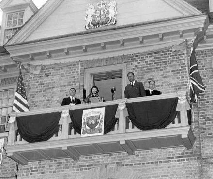 The Queen accepts the adulation of the assembled students, faculty, and townsfolk from the college balcony. Above, in 1957, and below, in 2007. The building is the only structure in the New World designed by Sir Christopher Wren.