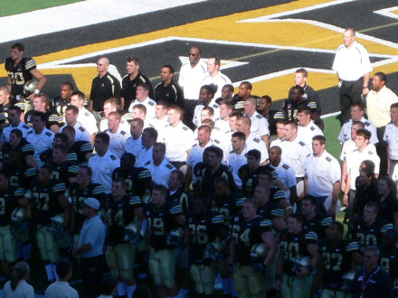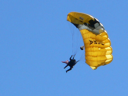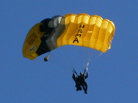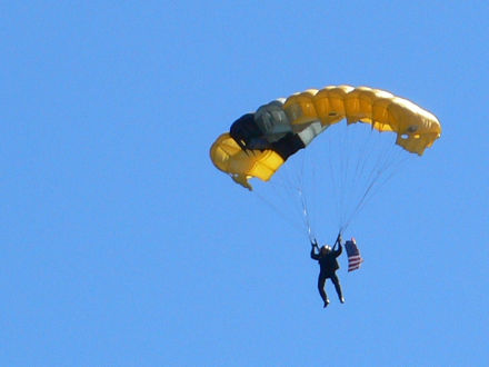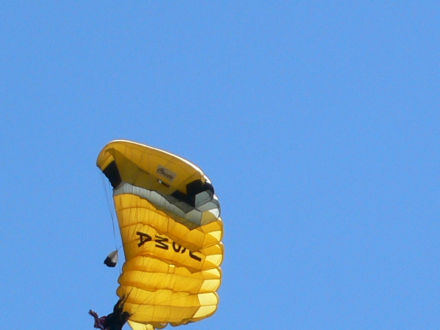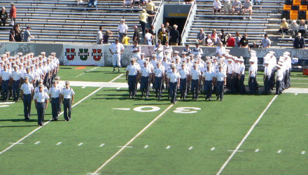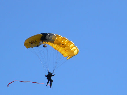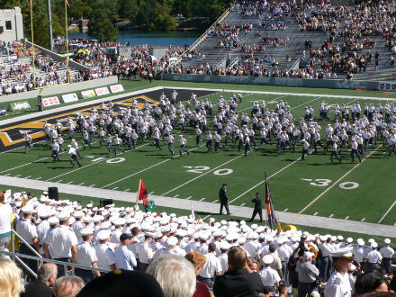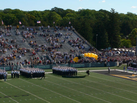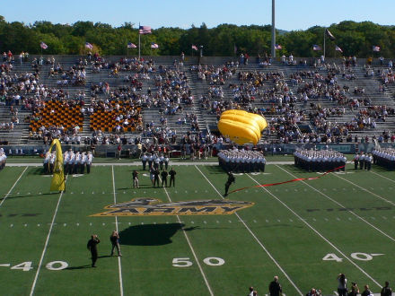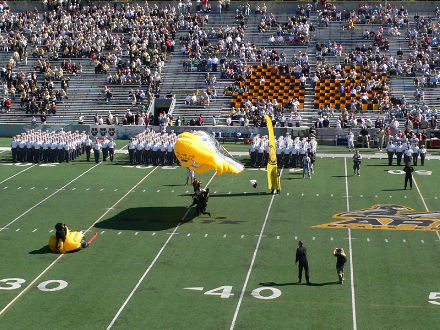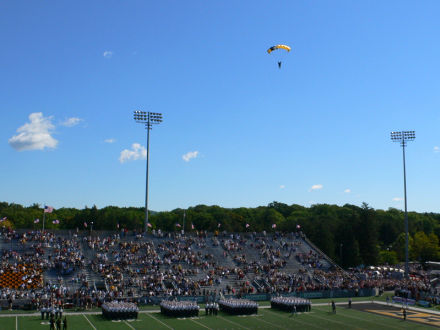 Before the game starts, a handful of cadets parachute onto the field, the last one bringing the football for the game.