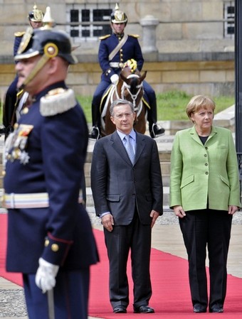 The Chancellor of Germany is seen here worriedly admiring the pickelhaubed cavalry on her state visit to Colombia. Such elements of tradition, widespread in South America, are unofficially but totally banned in Germany.