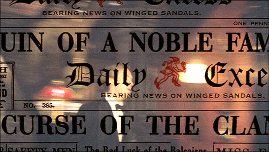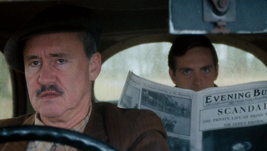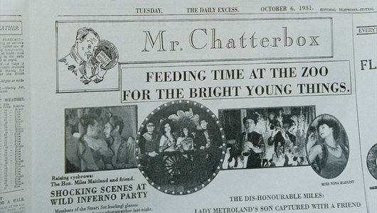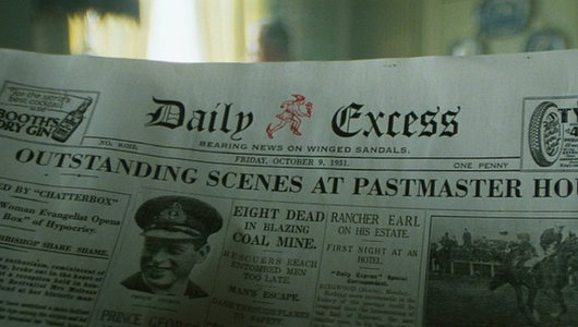 In Vile Bodies, Adam Fenwick-Symes is in debt to Canadian press baron Lord Monomark to the tune of one zeitgesit-capturing book manuscript. Monomark’s paper is the Daily Excess; other newspaper titles in the Waugh universe include Lord Copper’s Daily Beast, Lord Zinc’s Daily Brute. Fry’s “Bright Young Things” includes a number of fake newspapers, chief among them Monomark’s Excess. The filmmakers quite capably recreated the look and feel of 1930’s-era newspapers, usually by simply using altered copies of the Daily Express and inserting the required copy related to the film’s plot. Above, for example, we see the headline “OUTSTANDING SCENES AT PASTMASTER HOUSE” under the nameplate of the Daily Excess, but if we look under the headline of the “Rancher Earl on His Estate” we see a byline for “Daily Express Special Correspondent”.