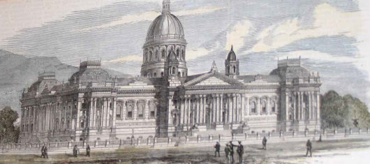 With the expansion of the Cape Colony, the responsibilities of the parliament grew and it became apparent that the ad-hoc nature of the legislature’s accommodation. The Public Works Department commissioned the architect Charles Freeman, responsible for a number of other structures around the town. Freeman handed over plans for a domed edifice (above) with end pavilions in an overall composite classical style. Governor Sir Henry Barkly laid the cornerstone in 1875 and the bulk of the building was constructed according to Freeman’s plans. The architect, however, had poorly judged the foundations of the building and the dome had to be abandoned, an affair which caused some scandal at the time and drove Freeman from the office of government architect into private practice. Henry Greaves amended Freeman’s plans, and the building was completed — without dome — in 1884.