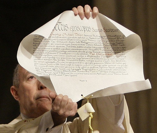 The Most Rev. Timothy Michael Dolan, the newly installed Archbishop of New York, has a reputation as a genial beer-swilling giant that will doubtless serve him well as he takes possession of his new see. With a Ph.D. in Church History, Archbishop Dolan formerly served as Secretary to the Nuncio in Washington, D.C. before becoming Rector of the Pontifical North American College in Rome — the “West Point” of the Catholic Church in Anglo-America. Having improved the NAC’s reputation both in studies and in orthodoxy, Msgr. Dolan was then sent by the Holy Father to be an Auxiliary Bishop in the Archdiocese of St. Louis. From there, our man was given the charge of see himself, that of Milwaukee.