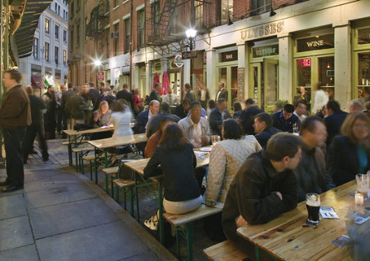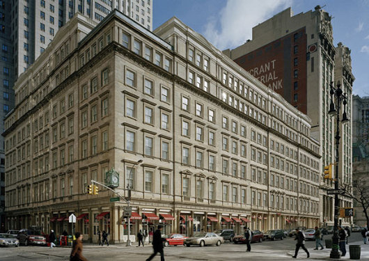 Aside from Grand Central Terminal, their most famous rehabilitation, Beyer Blinder Belle are known for their restoration work at the Basilica of the Assumption in Baltimore (the first cathedral in the United States), the New York Yacht Club, and Hoboken Terminal. BBB helped transform Stone Street (above) in lower Manhattan from an ordinary tarmac lane into a stone-paved pedestrian street with several bars and restaurants. The firm also restored the Sun Building (below), the original home of the New York Sun. The renovation was so successful that when the Sun was revived in 2002 after a fifty-year absence, it found its original offices too expensive to rent.
