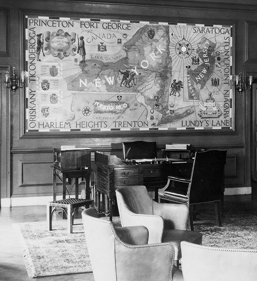 One of the best aspects of the inter-war construction of Governors Island is that the refinement of McKim Mead & White’s architecture is matched inside by a series of interior murals painted under the auspices of the WPA. These murals often veered towards the refreshingly jocular, as can be seen in the War of 1812 mural in Pershing Hall (a corner of which is captured here by photographer Andrew Moore). The mural by Major Tom Loftin Johnson (educated at the Ecole des Beaux-Arts in Paris) depicted here, however, is a map of the area under the purview of the Second Corps, U.S. Army headquartered at Governors Island; namely the states of New York, New Jersey, and Delaware, and the then-territory of Puerto Rico.