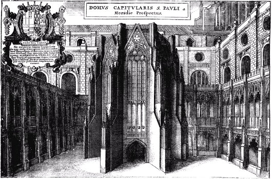 Interesting — in the woodcut showing the burning of Old St. Paul’s, you see the Latin words, “etiam periere ruinae.” This is a quotation of line 9.969 of the “Pharsalia” (a.k.a. “Bellum Civile”), a Latin epic poem written during the reign of Nero by the poet Lucan. The original quotation describes the ruins of Troy — “even the ruins have perished.”