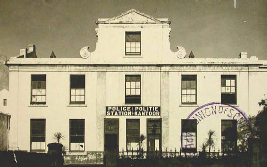 The sign on the façade of No. 7 Wale Street, Cape Town in this 1891 photo informs us of its status as a police station in the two official languages of the day, English and Dutch, not Afrikaans. ‘Politie’ is the Dutch word for Police, while the Afrikaans is ‘Polisie’. Afrikaans only became an official language of South Africa in 1925, but was so alongside Dutch and English until 1961, when Dutch was finally dropped.