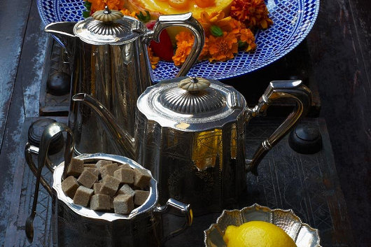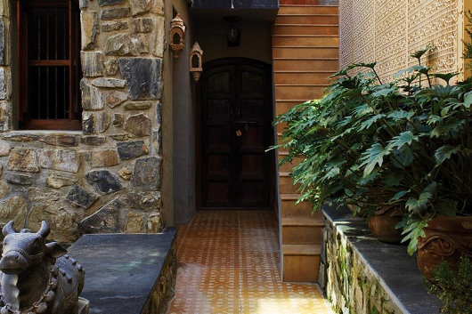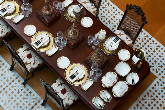 Die eetkamertafel is gedek met ’n 14-stuk eetservies, spesiaal gemaak vir die Baroda-paleis in Gujarat, met die koninklike wapenskild in goud gedruk. Die marmer in die vloer kom al die pad uit Jaisalmer in Rajasthan.