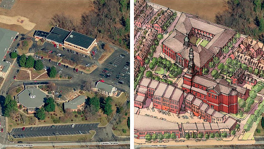 The widespread unsightliness of suburban development in the United States is one of the most significant counts one can hold against the country. The earliest suburbs, or indeed any that are pre-war, came out fairly well by contrast. One of the pleasures of living in Westchester is our system of verdant parkways (from the inter-war period) with arched stone bridges spanning the little creeks and carrying local thoroughfares over the road. The transformation of Long Island, after the Second World War, from countryside to row after row of mass-produced cookie-cutter homes was disastrous. (Levittown is my personal vision of Hell — identical homes completely divorced from any sense of livable social order.) Post-war suburban development combines ugliness, boringness, and an astonishing misuse of available land. Erik Bootsma, however, here presents a model proposal of how to transform the medium-sized property of a modern suburban parish church in Virginia into a small, livable neighborhood.