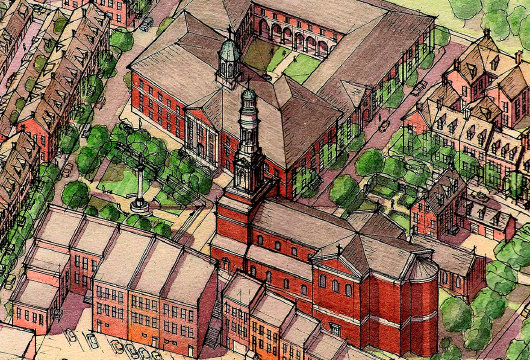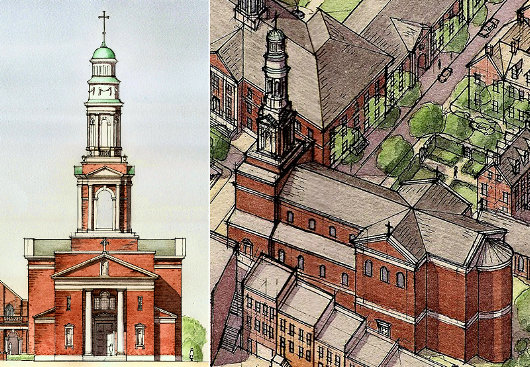 The design for the church itself is quite handsome in its definitively American Georgian style. I’m not a huge fan of the portico, however. I’d prefer a broad overhang supported by a series of columns. But the overall concept unquestionably gets a thumbs-up.