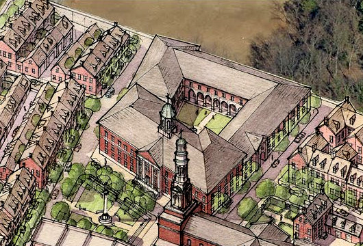 The plan, drawn up by Grenfell Architecture, transforms the property in a small neighborhood — practically a village in its own right. A commercial quarter, a church, rectory, school, and townhouses, all surround a small common.