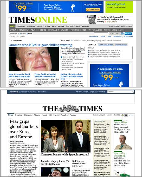 The home page itself is what I give the most points. Most newspaper websites don’t seem to be influenced by any design tradition whatsoever. The new Times website gives the feel of a newspaper without being overly trapped to the actual layout of one. It is informed by newspaper design rather than enslaved to it. (Click here to see a comparison of timesonline.co.uk to thetimes.co.uk).