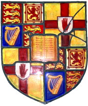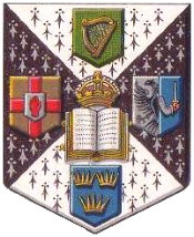Unfortunately I can find little on hand about the origins of NUI’s coat of arms. They are admirable in their simplicity: a Brian Boru harp on a green field, with a shamrock’d star above. The National University of Ireland has followed UCD’s lamentable trend of disregarding its coat of arms for a psuedo-heraldic logo of a gold harp on a funkified shield with the star-and-shamrock moved out, floating above the shield. The new logo is a heraldic anomaly, because removing the star-and-shamrock from the shield makes it identical to the provincial arms of Leinster, thus creating cross-purposes of identification. Is it the National University of Ireland, or of Leinster? One would hope that a learned institution, especially one in a country with a heraldic authority, would be able to avoid such visual confusion.