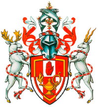 The New University of Ulster was founded in 1968, and later merged with the Ulster Polytechnic in 1984 to become the University of Ulster. A year later, the College of Arms granted this achievement to the institution. The six alternating panels represent the six counties of Northern Ireland. The red hand, again, symbolises Ulster, while the lamp stands for learning. The supporters are an antelope — commemorating the University’s first chancellor, the 4th Duke of Abercorn — and an Irish elk from the provincial arms.