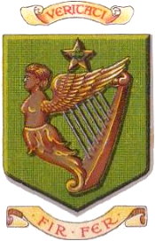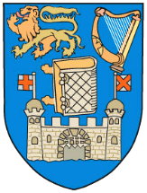 The arms are blazoned: Vert a harp or stringed argent, on a chief of the second on a pale azure between two trefoils slipped vert three castles flammant proper.
