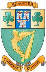 The university’s arms, granted in the nineteenth century, are blazoned Quarterly azure and ermine. First quarter a book open proper, bound gules, clasped or, and in fourth quarter a castle of two towers argent, flamant proper. Overall in the centre point the harp of Ireland ensigned with the royal crown. The castle with fired towers is a reference to the arms of the city of Dublin. While it is the university, not Trinity College, that awards degrees, the university arms were not used on degree certificates until 1963, when President John F. Kennedy was granted an honorary doctorate of law in St. Patrick’s Hall at Dublin Castle.