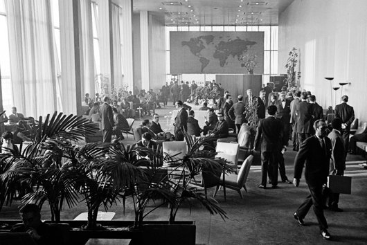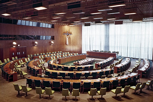 The interiors have only been altered slightly here and there over the decades — after all, any change would require a broad agreement from a wide variety of countries. This means that a clean and crisp 1950s modernism has prevailed overall, alas partly undone by recent updates.