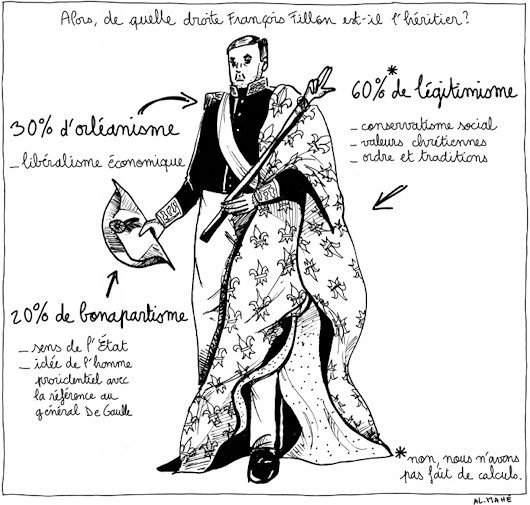 What to make of the current presidential candidate of the French right, M François Fillon? The Québécois website Dessinons les élections (“Let’s draw the elections”) sought to apply a Rémondian analysis of Monsieur Fillon in one of its weekly cartoons (by Frédéric Mérand & Anne-Laure Mahé).