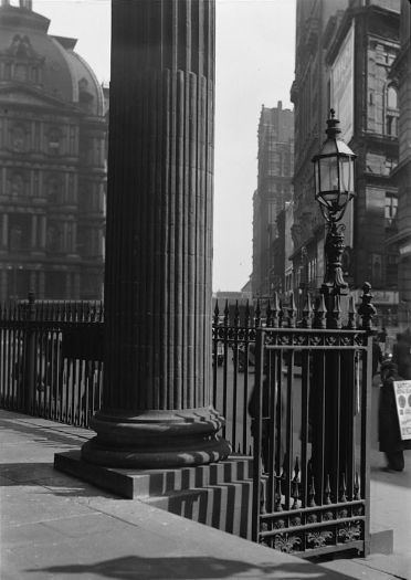 The steps of St. Paul’s Chapel, Broadway, looking towards Park Row, March 1937.