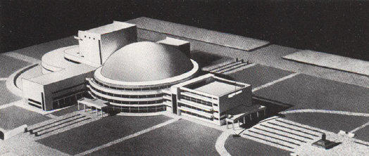 A classical design won the day, however, and the building was completed in 1945. As you can see, the Novosibirsk structure fails to follow Boullée in unifying the entire opera house under a single dome, but rather opts for the more pragmatic if less handsome separate flyspace. (Interestingly, the ratio of its dome’s thickness to its radius is less than that of a typical chicken egg). I still hope someone comes around and fulfills Boullée’s plan.