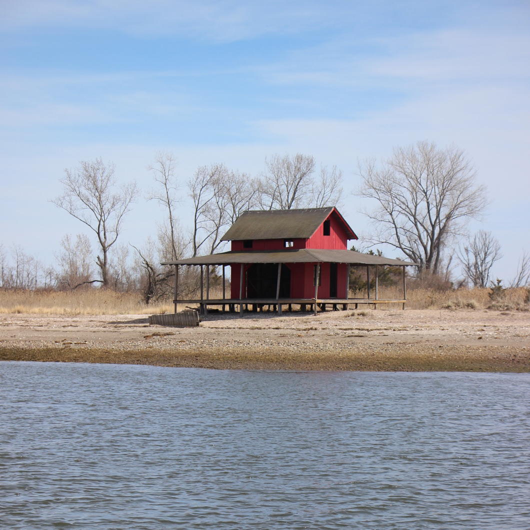 Below, a simple boathouse built at the highwater mark on a New England beach.