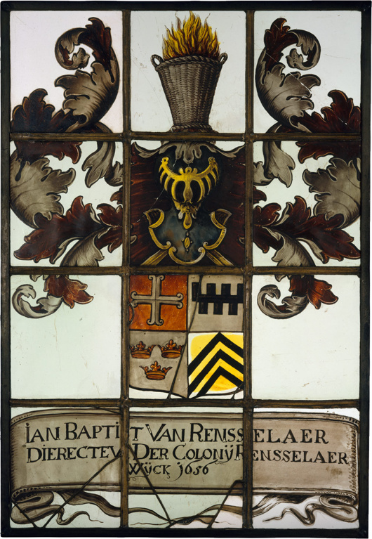 Jan Baptist was Kiliaen’s second surviving son, and served as director at the ‘colony’ as it was often known from 1652 to 1658. He commissioned Evert Duyckinck to make this painted-glass window displaying his coat of arms in 1656 and gave it to the Dutch Reformed Church in Beverwyck (today’s Albany).