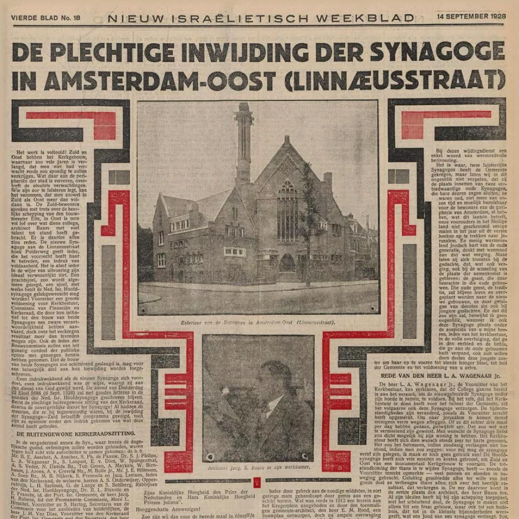 Baars designed the 1928 Synagoge Oost (East Synagogue) on Linnaeusstraat (Linnaeus Street) in the Transvaalbuurt neighbourhood that was developed in the first decades of the twentieth century.
