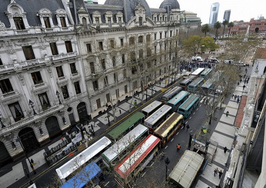 This news photo showing a protest (what else?) of bus drivers on the Avenida de Mayo in Buenos Aires gives a good view of the capital’s city hall. The municipal headquarters is located between the Plaza de Mayo and the former home of the newspaper La Prensa; the Casa Rosada, Argentina’s presidential palace (officially called Government House, Casa del Gobierno) can be seen in the distance at the end of the square.