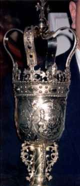 The Royal Arms, depicted in three places on the mace, most prominently outside the bowl and inside the base of the crown, are those of George II, Britain’s second German king known for his poor grasp of the English language.
