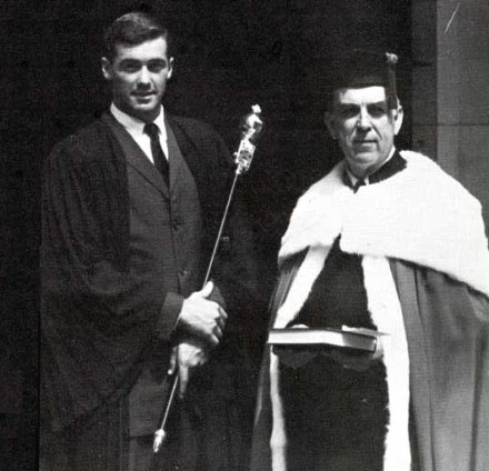 George Hart, President of the Order of Gownsmen, bears the University Mace for the Vice-Chancellor, Dr. McCrady