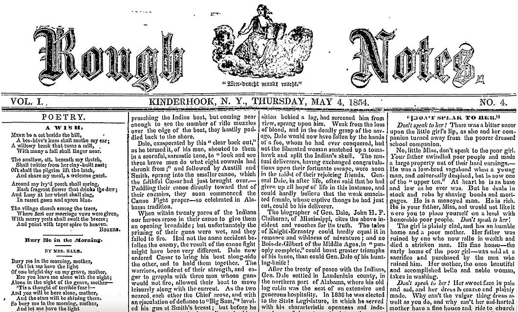 Like many towns up and down the Hudson valley, Kinderhook had its own newspaper — originally named the Kinderhook Herald but which later took up the idiosyncratic name of Rough Notes.