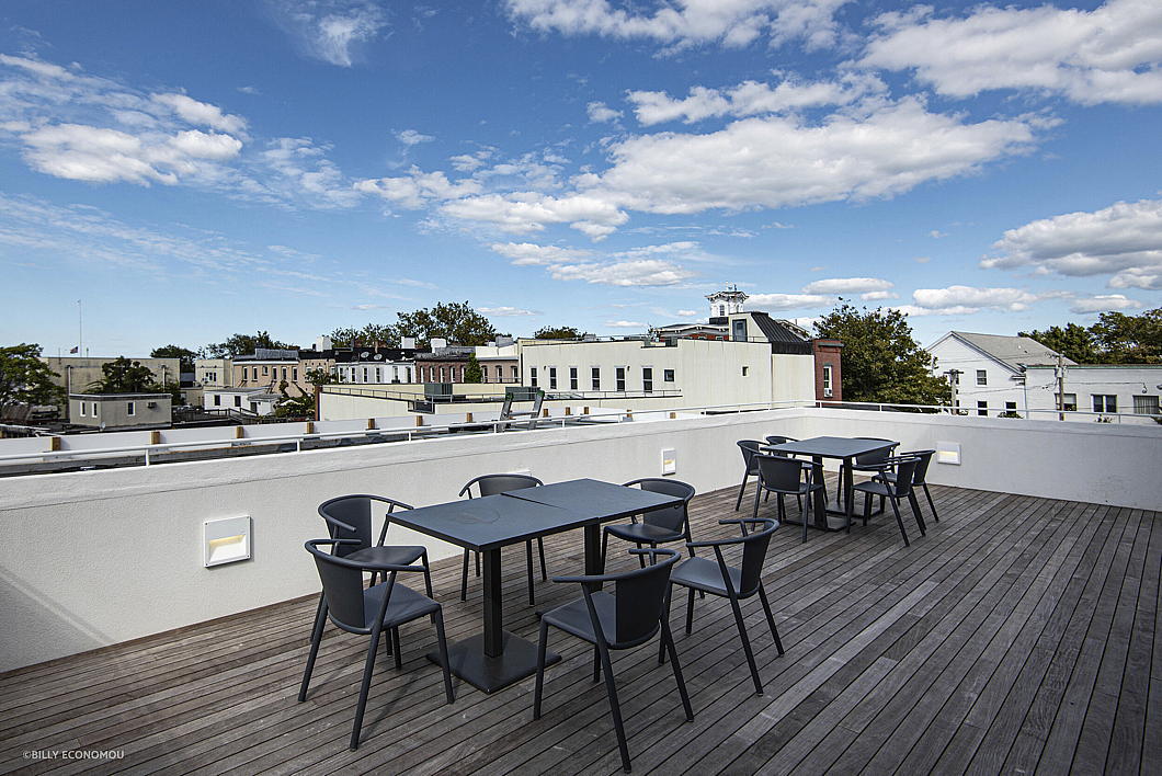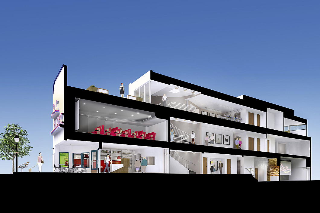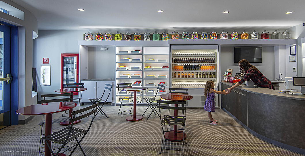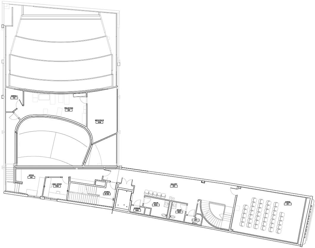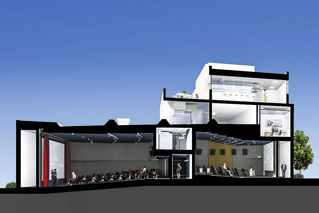 NK Architects also created a new bar and lounge, two roof terraces, an art gallery, and educational space within the original footprint of the cinema.
