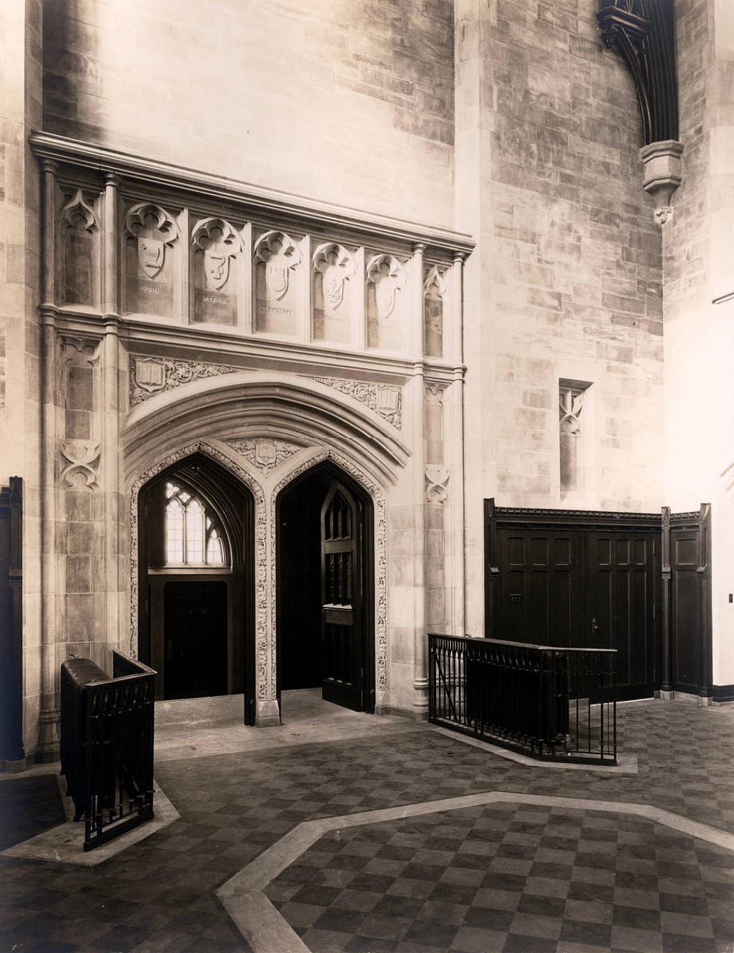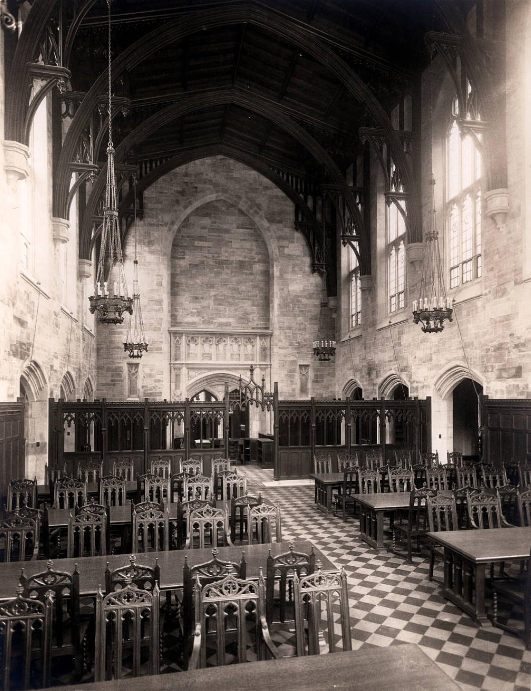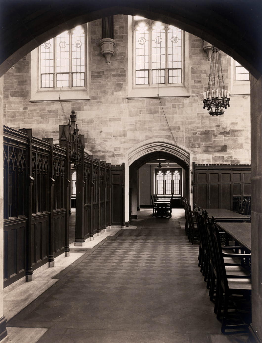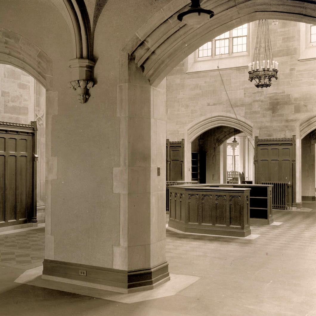 Circulation to the flanking wings of the library is through low arches that were frequently deployed in interwar American Gothic interior spaces, particularly in New York. (Viz. South Dutch Reformed Church [now Park Avenue Christian Church] in Manhattan, St Joseph’s Church in Bronxville, and elsewhere.)
