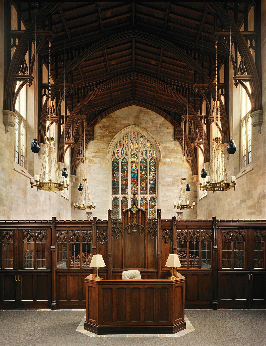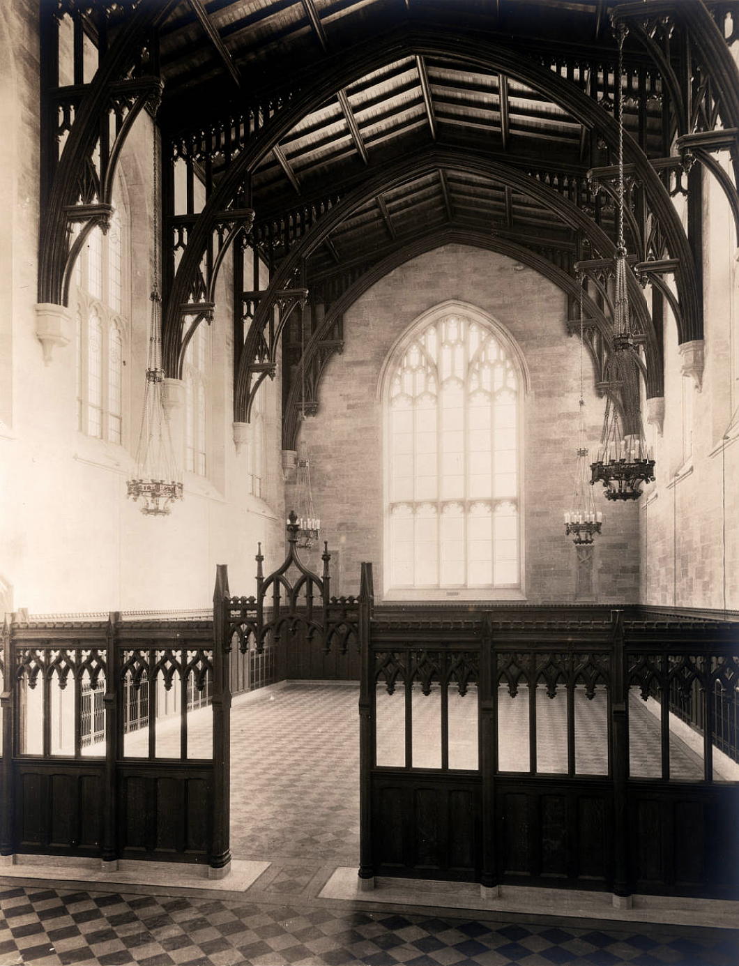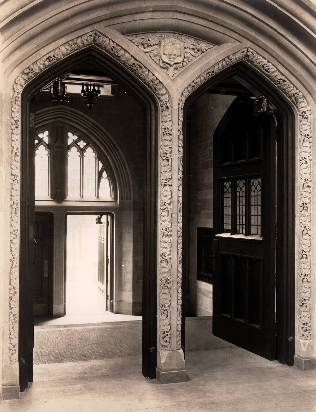 Circulation to the flanking wings of the library is through low arches that were frequently deployed in interwar American Gothic interior spaces, particularly in New York. (Viz. South Dutch Reformed Church [now Park Avenue Christian Church] in Manhattan, St Joseph’s Church in Bronxville, and elsewhere.)