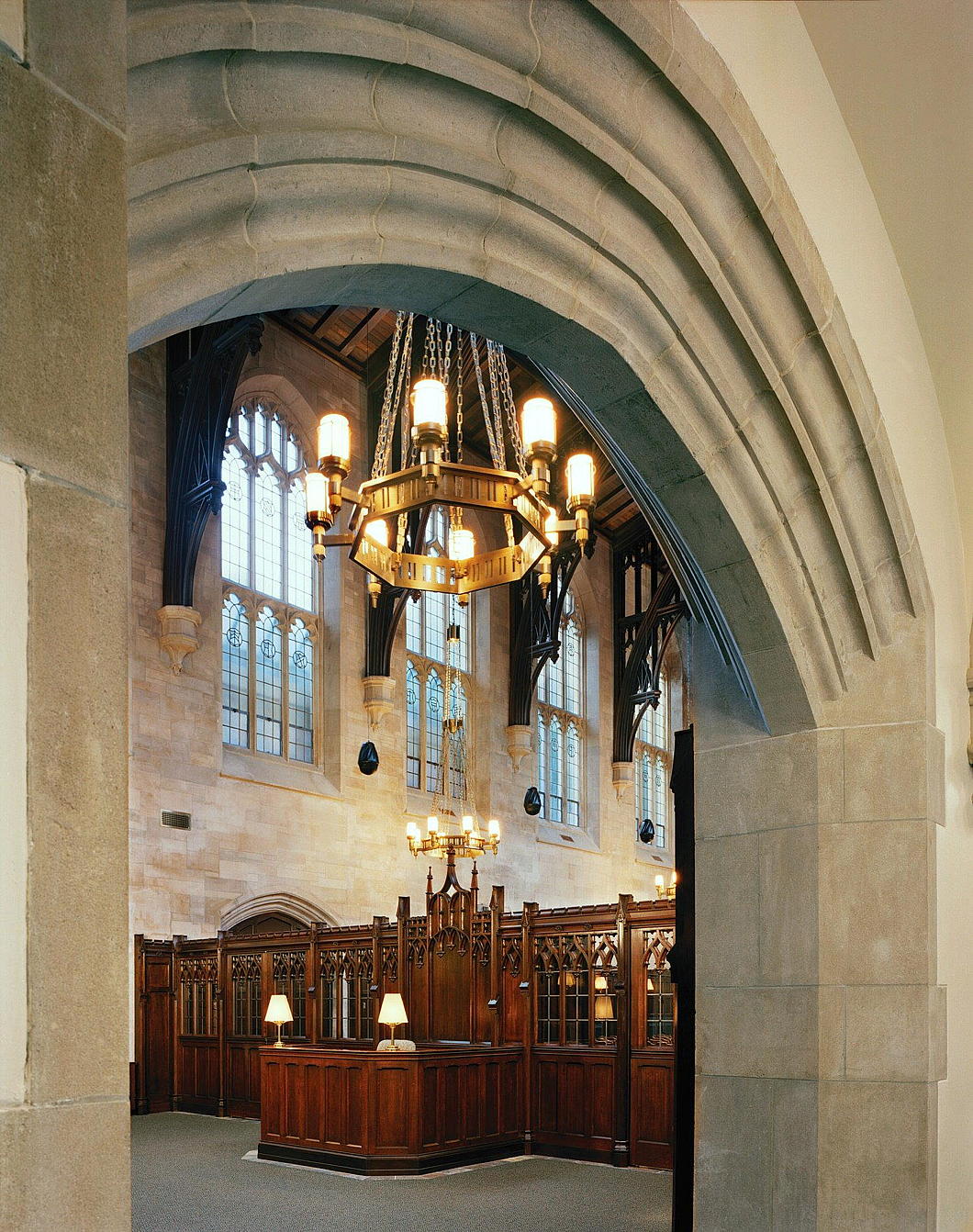 Through these doors with their intricately carved surrounds, the reader enters the great hall of the library, passing a circulation desk — housing no-doubt assiduous and eagle-eyed librarians preserving order and quiet — and onward through a carved wooden screen to the reading area beyond.