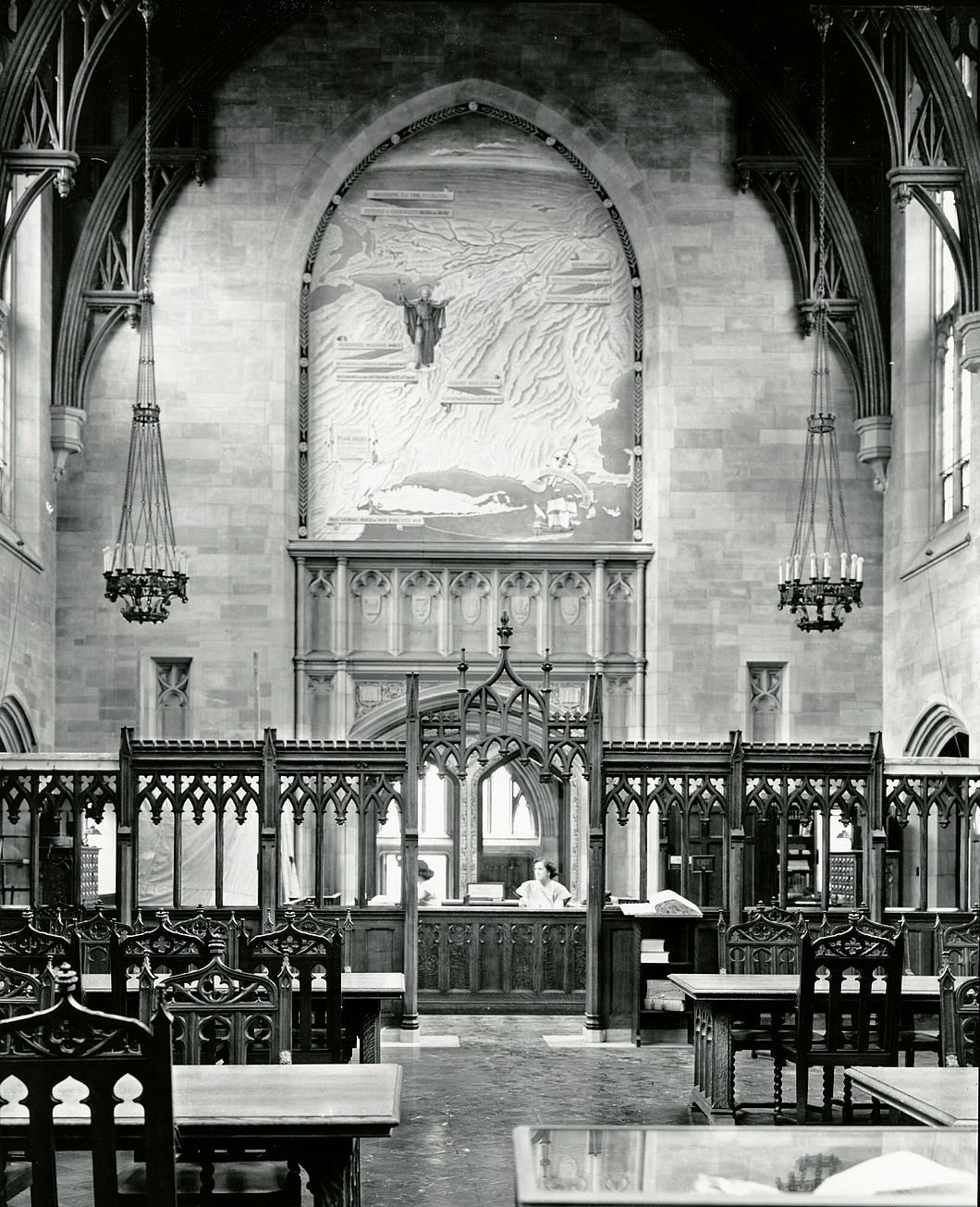 The sacral aura of the building was increased in 1949 when the mural ‘The Journeys of St Isaac Jogues in the New World’ was installed in the gothic arch of the reading room.